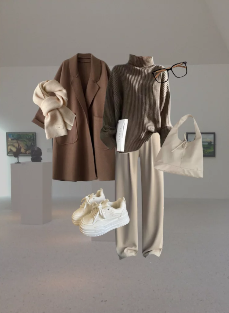 Comfortable Casual Style: Loose knit sweater + wide-leg pants with high waist + loafers. Elegant and comfortable. Comfortable clothing can help you spend more time in museums.